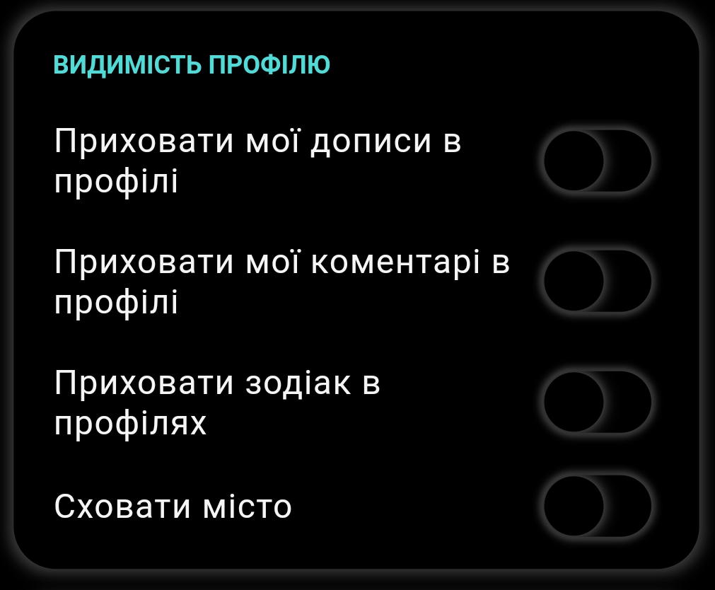 Гнучкість у заповненні профілю — більшість полів необов’язкові. Можна приховати знак зодіаку, публічні пости, коментарі.