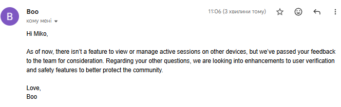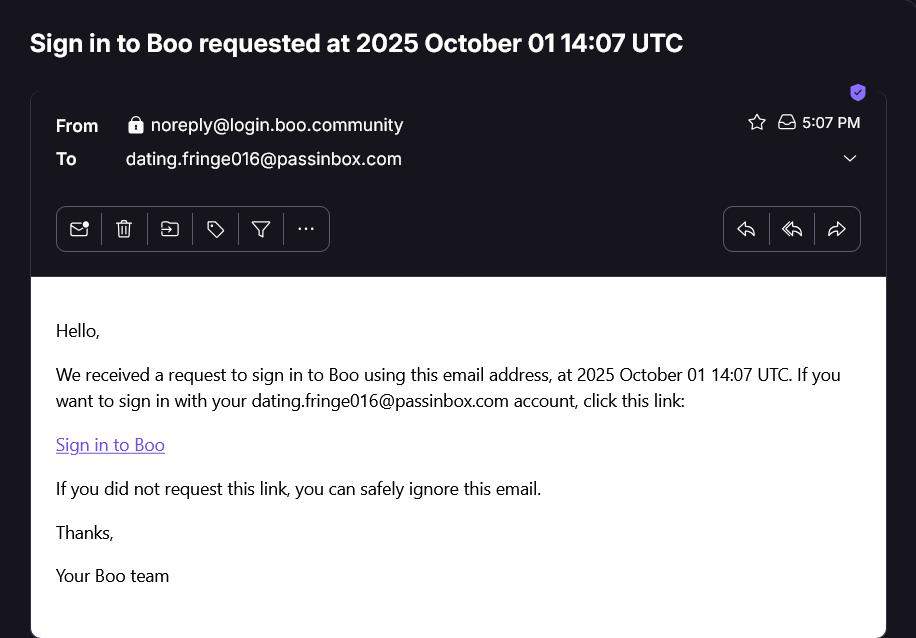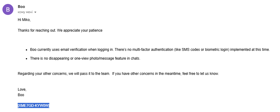 Boo працює через так званий магічний лінк: вводимо email, отримуємо лист із посиланням, заходимо. Паролів немає, а отже й проблем зі слабкими паролями теж. Такий підхід створює єдину точку компрометації: доступ до вашої пошти автоматично відкриває доступ до профілю. Додаткових механізмів відновлення немає — без SMS, резервного email чи MFA весь захист тримається лише на одному каналі.