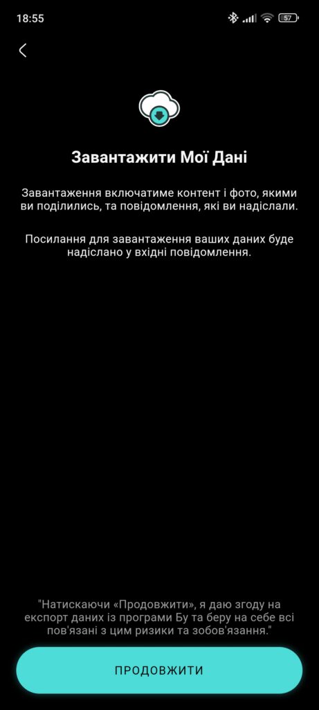 Boo дає можливість експортувати особисті дані прямо через налаштуваннях застосунку. Єдине обмеження і водночас логічний крок в контексті приватності: для завантаження історії чатів потрібна згода обох співрозмовників.