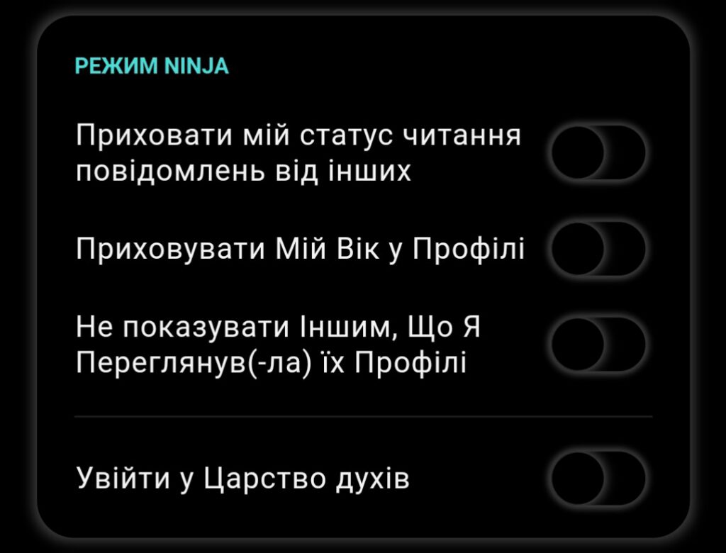 Безоплатна функція призупинення акаунта робить профіль повністю невидимим. Платний режим Ninja розширює контроль приватності та приховує статуси прочитання і перегляду профілів.