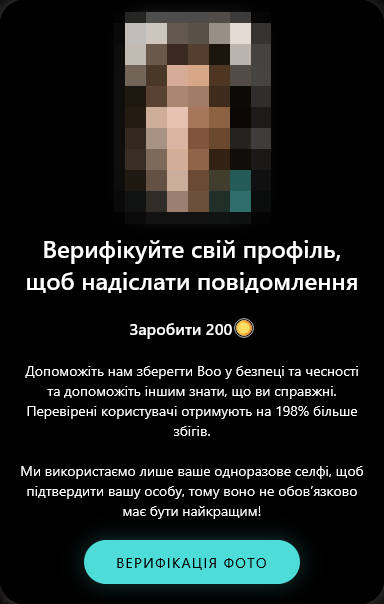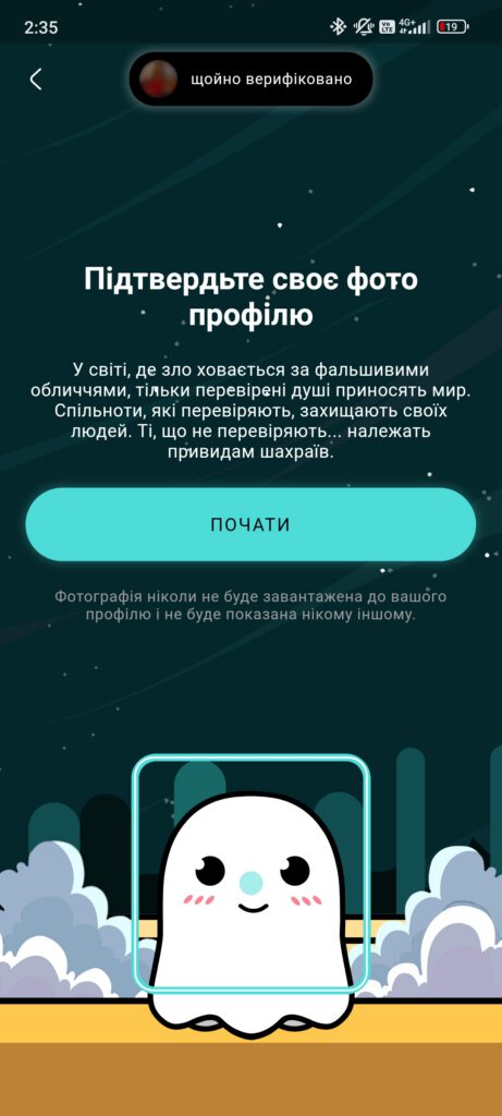 Фільтр верифікації дозволяє взаємодіяти лише з перевіреними користувачами: «Пройди перевірку та познайомся з іншими реальними користувачами, використовуючи фільтр перевірки. Більше ніякого обману та ботів».