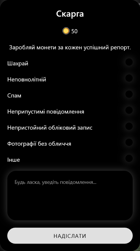 Антискриншотний захист працює в мобільному застосунку (спроби зробити знімок екрана блокуються у чаті та при перегляді профілів).