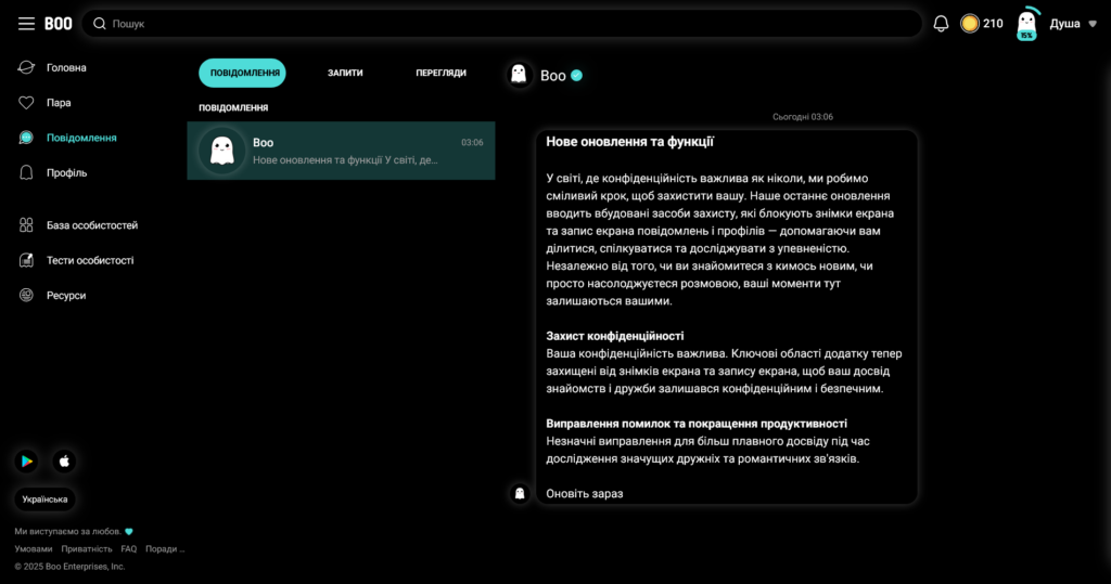 Інтерфейс і FAQ доступні українською, існує навіть окрема секція матеріалів. Помітно, що частина текстів перекладена машинно (втім, Boo також використовує власний автопереклад у чатах і профілях).