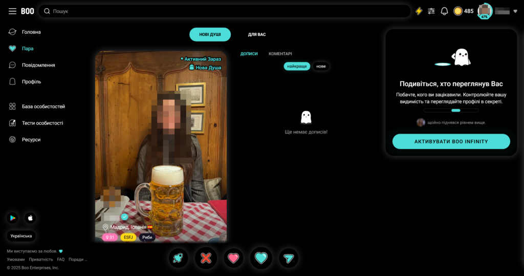 Boo робить ставку на виявлення психологічної сумісності через MBTI-алгоритм і тримає найжорсткішу в індустрії обов’язкову фото-верифікацію перед стартом будь-якого спілкування. Комбінація рідкісна — і справді працює як бар’єр проти ботів і фейків.