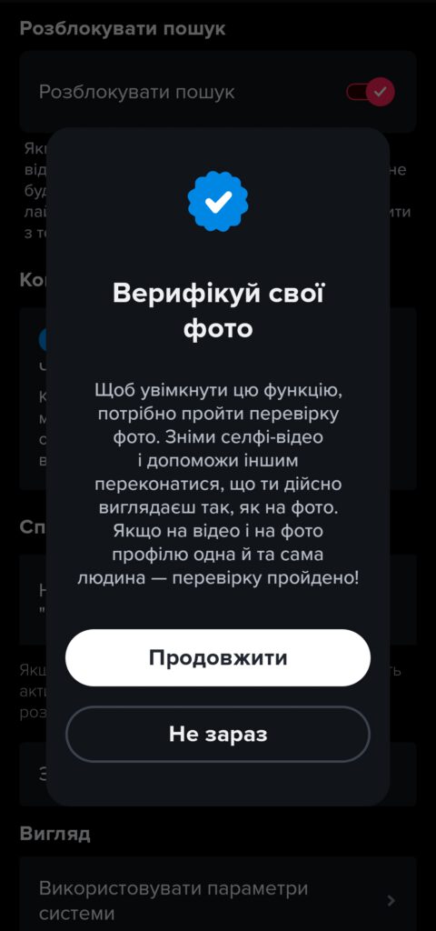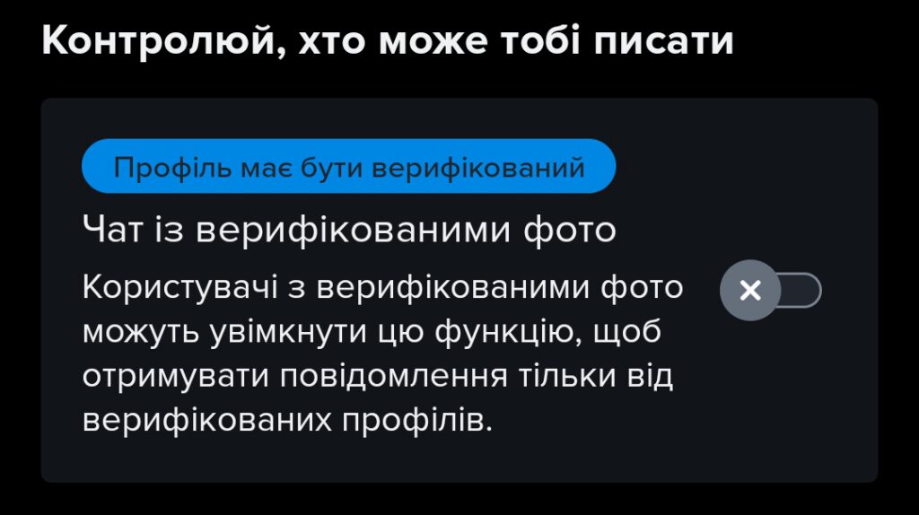 Є опція «Чат із верифікованими профілями» в налаштуваннях. Проста галочка, що фільтрує непідтверджені профілі — прямий спосіб обмежити контакти з підозрілими акаунтами.