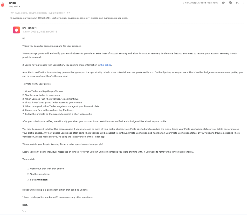Tinder — це глобальний лідер індустрії, який інвестує у модерацію і цифрову просвіту, але поки що не подбав про елементарні безпекові функції: багатофакторну автентифікацію, можливість контролювати сесії і видаляти повідомлення. Match Group заробляє мільярди, але захист користувачів не є достатнім.