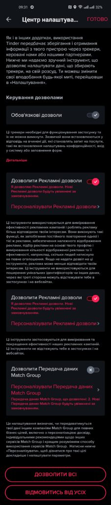 Tinder збирає щонайменше 16 типів даних в App Store та 20 в Google Play. Є базовий контроль за рекламними трекерами в налаштуваннях і можливість керування трекерами. Апетит цієї компанії до даних користувачів, за нашою оцінкою, помірний.