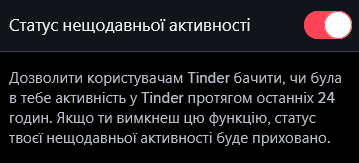 Tinder має прозору й зрозумілу процедуру видалення власного профілю і всіх пов’язаних із ним даних. Користувач може зробити це самостійно через налаштування.