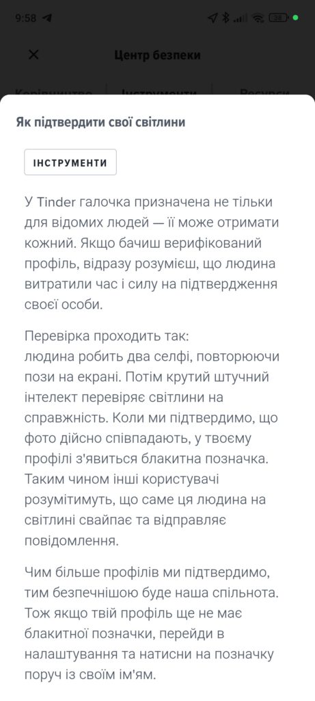 Жодної перевірки документів для українських користувачів. І хоча в офіційній політиці компанія заявляє про те, що у Tinder не може бути неповнолітніх — без функції документальної верифікації це більше схоже на побажання, ніж на систему.