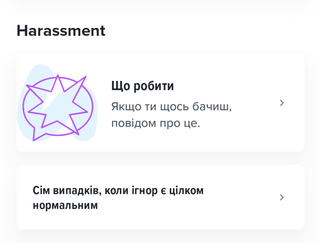 Є окремі матеріали про харасмент, можливість блокування, репортування токсичної поведінки. Фільтр безпеки також аналізує повідомлення на предмет потенційних загроз. Профілактика на гідному рівні.