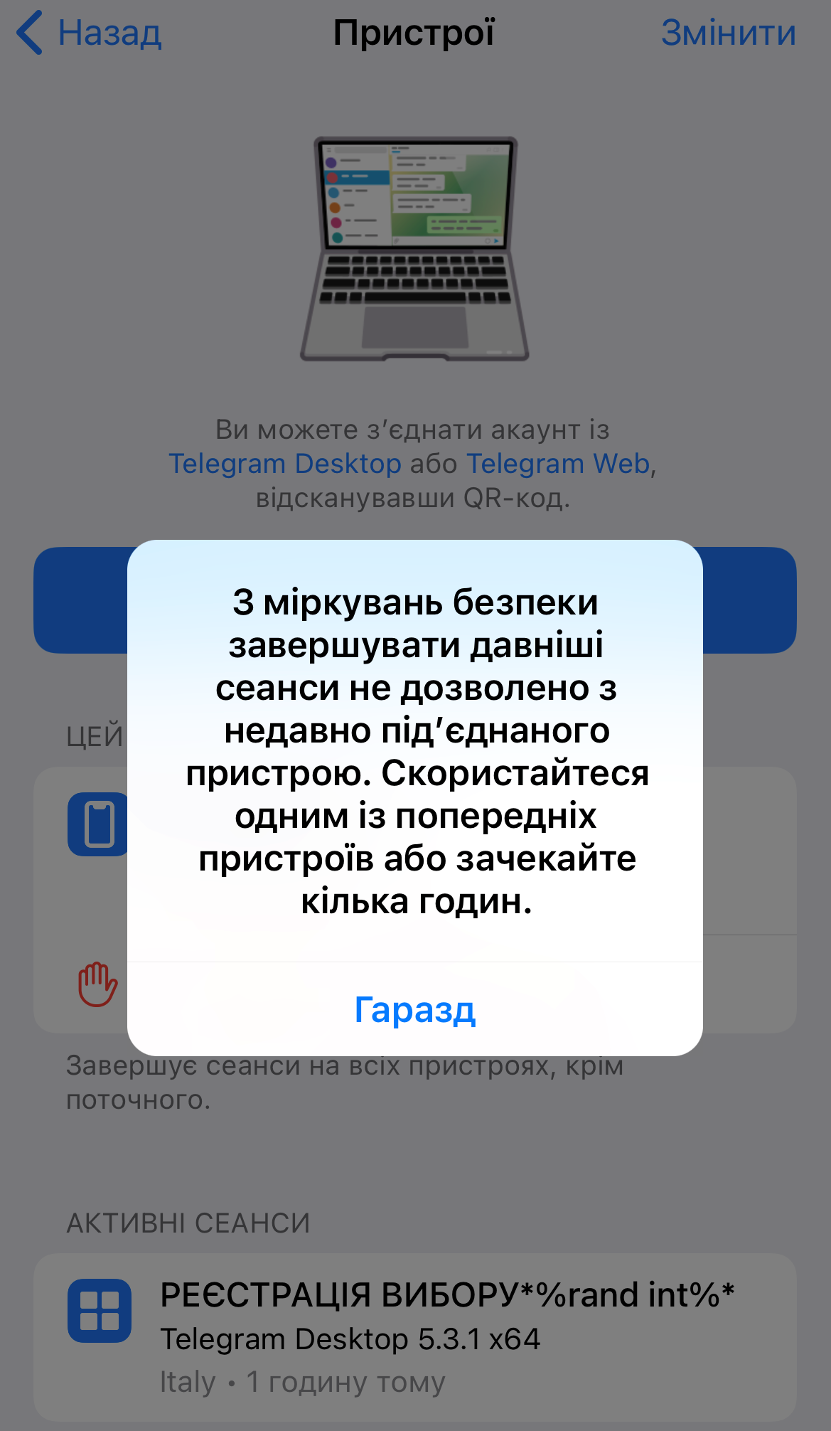 Коли користувач намагається проголосувати, сайт просить увійти через телеграм. Може з’явитися QR-код для прив’язки нового пристрою. Коли користувач відсканує код, шахрай отримає доступ до акаунту. Якщо жертва не помітить злам, через 24 години зловмисник зможе зробити свій пристрій «довіреним» і навіть викинути з акаунту справжнього власника.